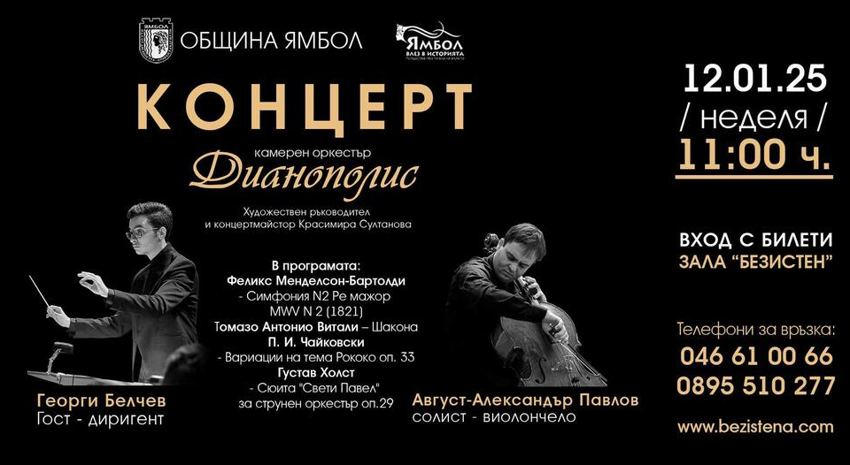 Ямболският камерен оркестър „Дианополис“ ще зарадва своята публика с първия си концерт за 2025 година на 12 януари. Специални гости на събитието ще бъдат талантливият виолончелист Август-Александър Павлов и младият диригент Георги Белчев.