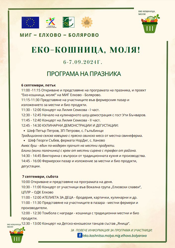 Паралелно с този празник в Елхово ще се проведе и двудневното събитие „Еко кошница, моля!“, организирано от Местната инициативна група – Елхово-Болярово. То ще събере местни производители и преработватели на екологично чисти продукти, като мед, млечни изделия, плодове и зеленчуци, отглеждани с щадящи технологии. Посетителите ще имат възможността да опитат и закупят разнообразни екологични продукти, както и да се включат в демонстрации по приготвяне на традиционни ястия с местни съставки. Събитието ще включва дегустации на сирене, мед и други местни деликатеси, а за най-малките ще има специални кулинарни ателиета, в които ще се учат да приготвят храни с местни продукти.