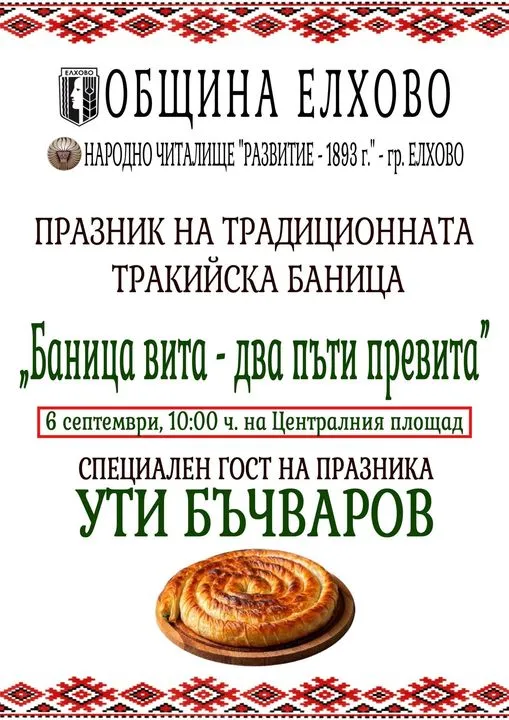 На 6 септември 2024 г., от 10:00 часа, централният площад в град Елхово ще бъде домакин на дванадесетото издание на празника на традиционната тракийска баница, наречен „Баница вита – два пъти превита“. Това събитие, организирано от Община Елхово и НЧ „Развитие – 1893“, ще събере участници от целия регион, които ще се състезават за титлата на най-вкусната баница. Специален гост и председател на журито ще бъде популярният кулинар Ути Бъчваров, който ще оценява различните видове баници, приготвени от участниците. Всеки от тях ще има право да участва с до три баници, без ограничения по отношение на вида – може да са както сладки, така и солени, с готови или ръчно точени кори.