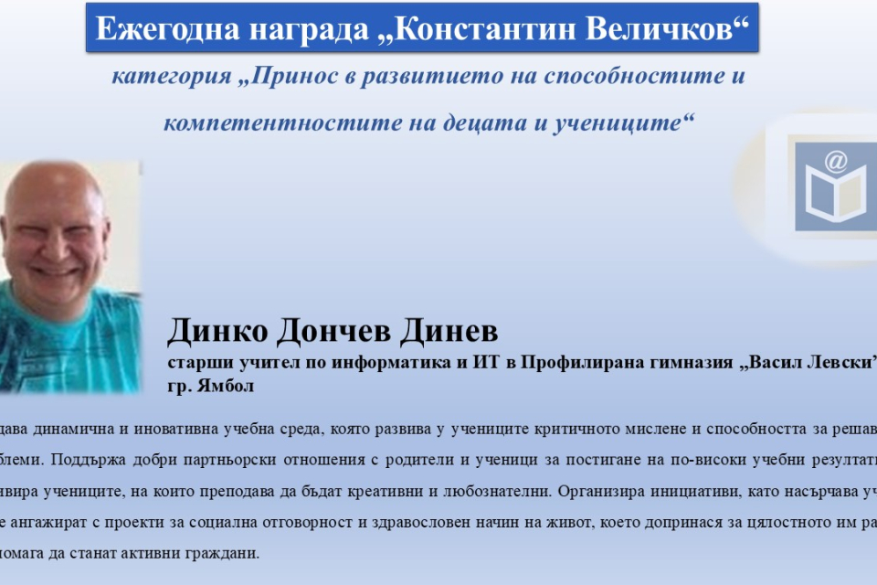 Динко Динев, старши учител по информатика и ИТ в Профилирана гимназия „Васил Левски“ в Ямбол, беше удостоен с престижната награда на Министерството на образованието и науката „Константин Величков“. Отличието бе връчено на Деня на народните будители в категория „Принос в развитието на способностите и компетентностите на децата и учениците“. Чрез иновативни методи като практическо обучение и проектна работа, Динев насърчава учениците си да развиват умения, които надхвърлят традиционната учебна програма и ги подготвят за реалния свят.